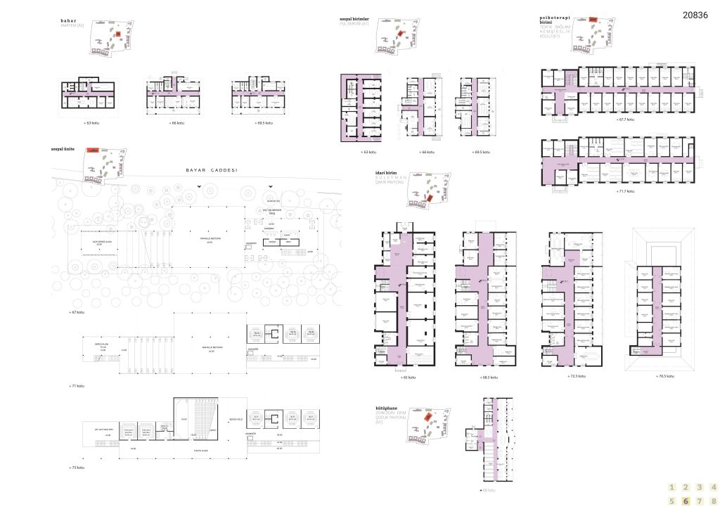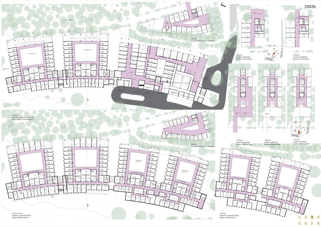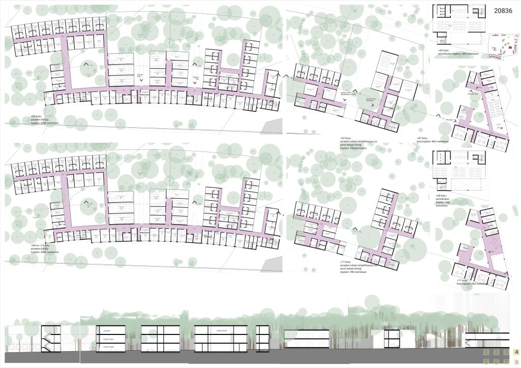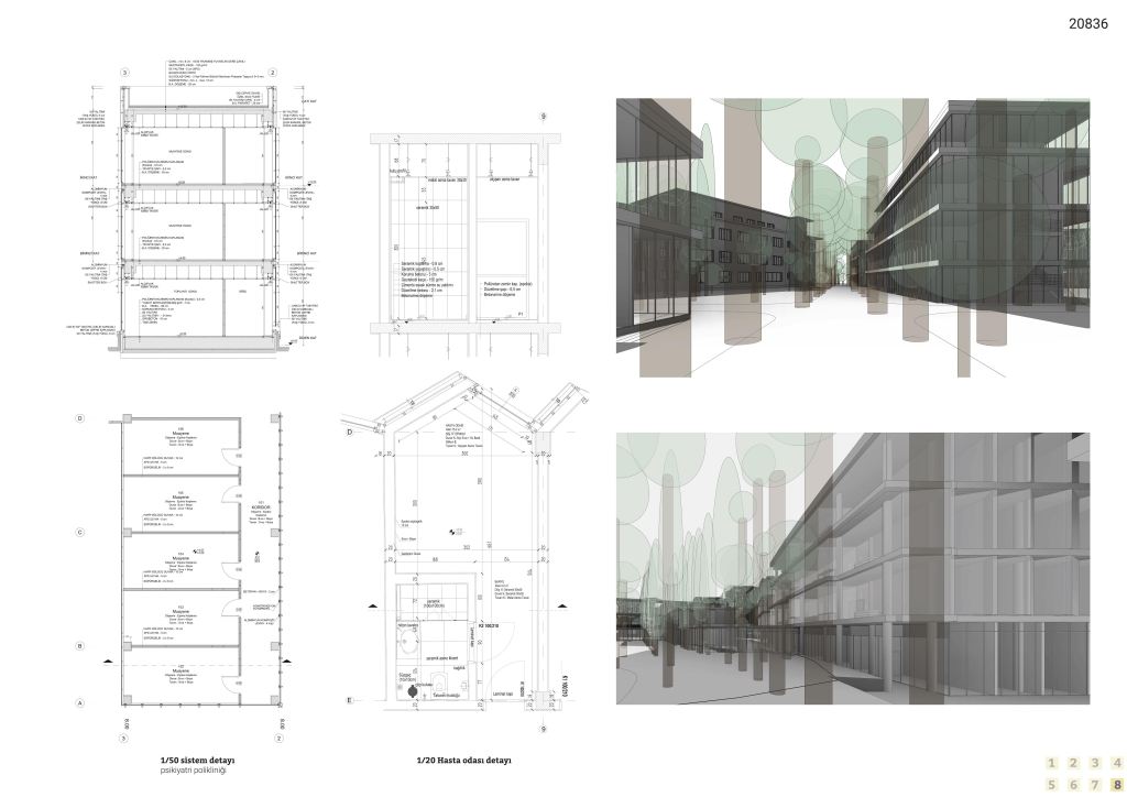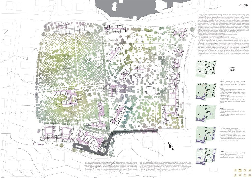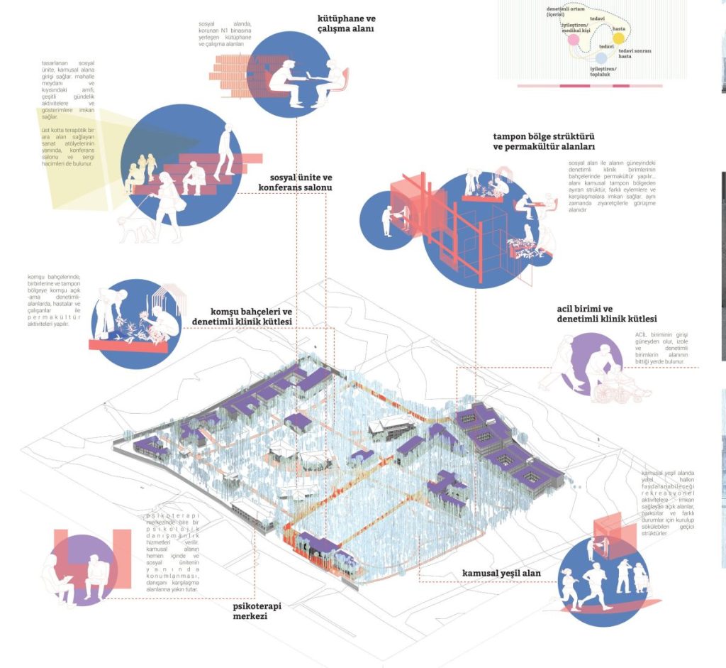 Alanlara ve serbestlik derecelerine dönecek olursak, burada “iyileşme” ve topluluğun bunun üzerindeki etkisi yeniden gündeme geliyor. Dışarıdaki topluluğu içeri çekmek ve içeride de bir topluluk yaratma çabamız, bir ruh ve sinir hastalıkları hastanesi olmanın yanında net ve iletişime izin vermeyen sınırların yarattığı negatif imgeyi sorunsallaştırmaktan geçiyor. Yerel halkın alanın kullanımına kısmen dahil olabilmesi, hem bu kıymetli yeşil alanın kamusallaşmasına ve yeşil alanın tanımladığı mevcut aksların korunabilmesine, hem de aslında alanın belleklerde yer etmiş olumsuz imgesinin üzerine bir “yeniden yazma” eylemine olanak tanır. Böylelikle alanın korunan doğal ve insan yapısı değerleri, hem yerel halk hem de kurumla etkileşimi olanlar tarafından yeni anlamlar kazanabilir. Ancak yine de, denetim ve izolasyon seviyesi yüksek yerlerin olması, sağlanması gereken bir şart olarak belirtilmiştir. Bu nedenle alanın Güneydoğu ve Güneybatısında kalan alanlara, yüksek denetim gerektiren birimler yerleştirilmişken, bunların kamusal alanla aralarındaki ilişkiyi kurgulamak için bir tampon bölge daha gerekli olmuştur – ki bu da alana yayılan poliklinik birimleri ile sağlanır. Dolayısıyla alana denetimli – yarı denetimli – kamusal olarak üçe ayrılır.
