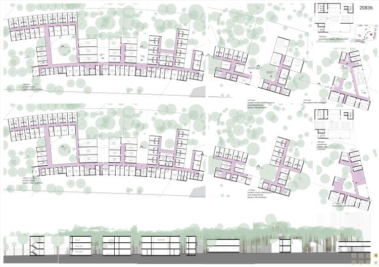 Alanın güneydoğusu ve güney batısındaki bölgelerde tasarlanan yataklı klinikler, hastanın iki aşamalı tedavisinin sürdürüldüğü yerlerdir. Bu yapılarda ilk aşamada hastalar üzerinde daha sıkı bir kontrol sağlanırken tedavi süresinin ikinci aşamasında ise mekanlar rahatlıyor., bireyin kendiliğinden iyileşmesine fırsat tanımak için mekan hastanın üzerinde -isterse- denetimi azaltıyor, geniş yürüme alanları bulunan ormanı kullanmasına izin veriyor. Odaların açılı bir şekilde ormana yönelmesiyle, hastalar odalarında da yeşil alanla iletişim kurabiliyorlar. Hastaların gününün çoğunluğunu geçirdiği ortak alanlar kuzeye yani ormana bakarken, doktorların odaları güneye bakıyor, böylelikle çevre parsellerdeki komşu yapıların hasta odaları ile ilişkileri kesilmiş olacağı gibi sağlık personeli dinleneceği zamanları kendine özel bir alanda geçirebiliyor. Avlulu olarak tasarlanan yapıların ormana bakan tarafında sosyal alanlar, ana kütleden çıkan kollarda ise maksimum manzaradan faydalanmak için açılı yerleştirilen odalar, arkası ise sağlık personelinin kullandığı alanlar olarak ayrılıyor.